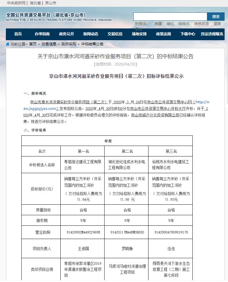 項(xiàng)目名稱:京山市漳水河河道采砂作業(yè)服務(wù)項(xiàng)目(第二次)http://www.jsggzyjyzx.com/Detail/1374項(xiàng)目法人:京山京誠產(chǎn)業(yè)化投資有限公司中標(biāo)金額:71.84元/立方米(服務(wù)期5年)......